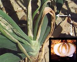 - Foliar lesions can rapidly coalesce, progressing to wilt and dieback of affected leaves. The pathogen moves from the leaves into the neck and bulb causing yellowish to light-brown discoloration.